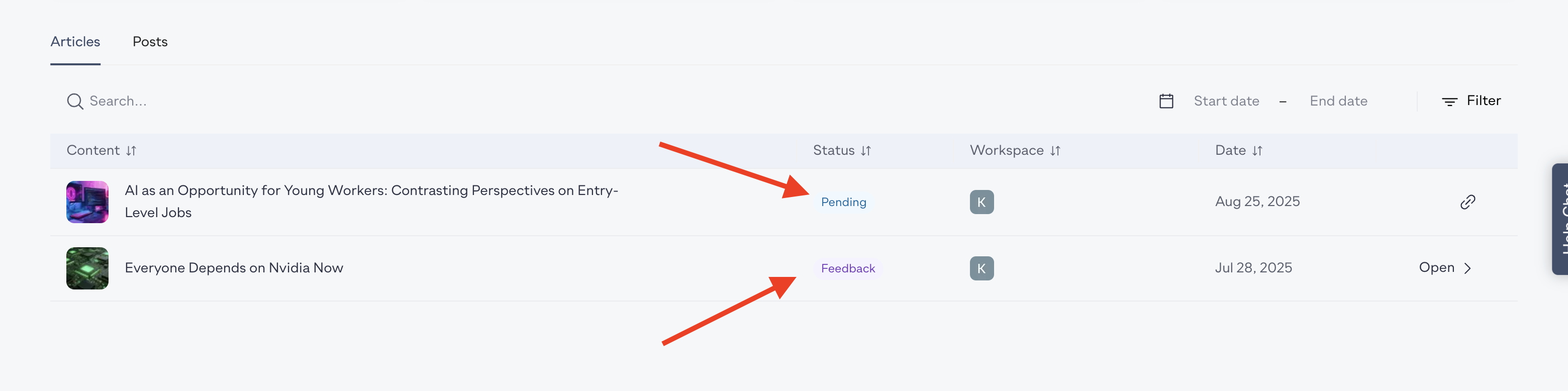 Approval to Publication Process Once content receives approval status, it becomes ready for publication. Published content automatically disappears from the content tracking list, maintaining clean oversight of pending items.