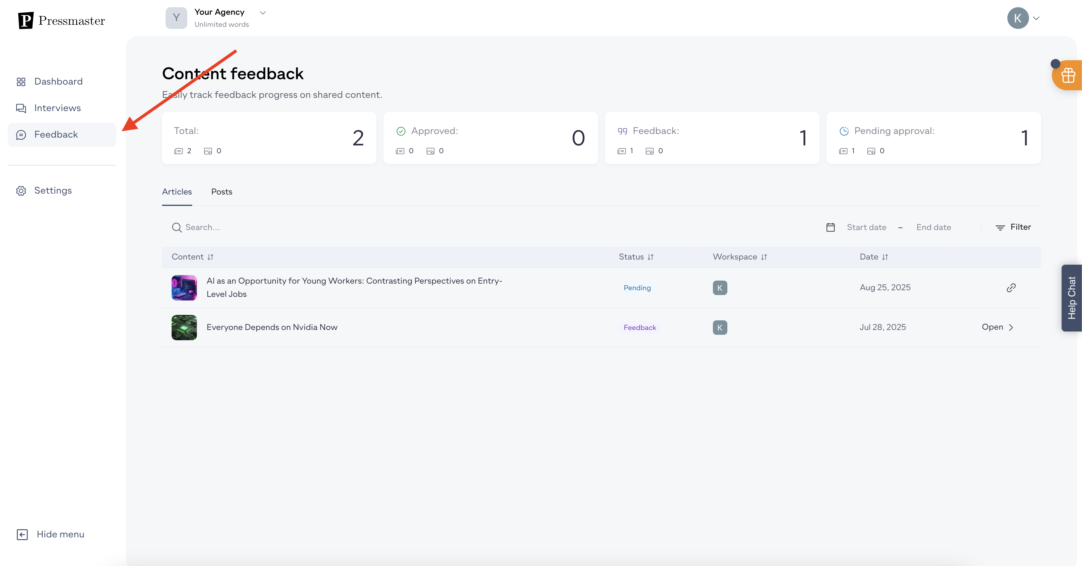Pending Feedback Content has been shared but customers have not yet provided feedback or approval.