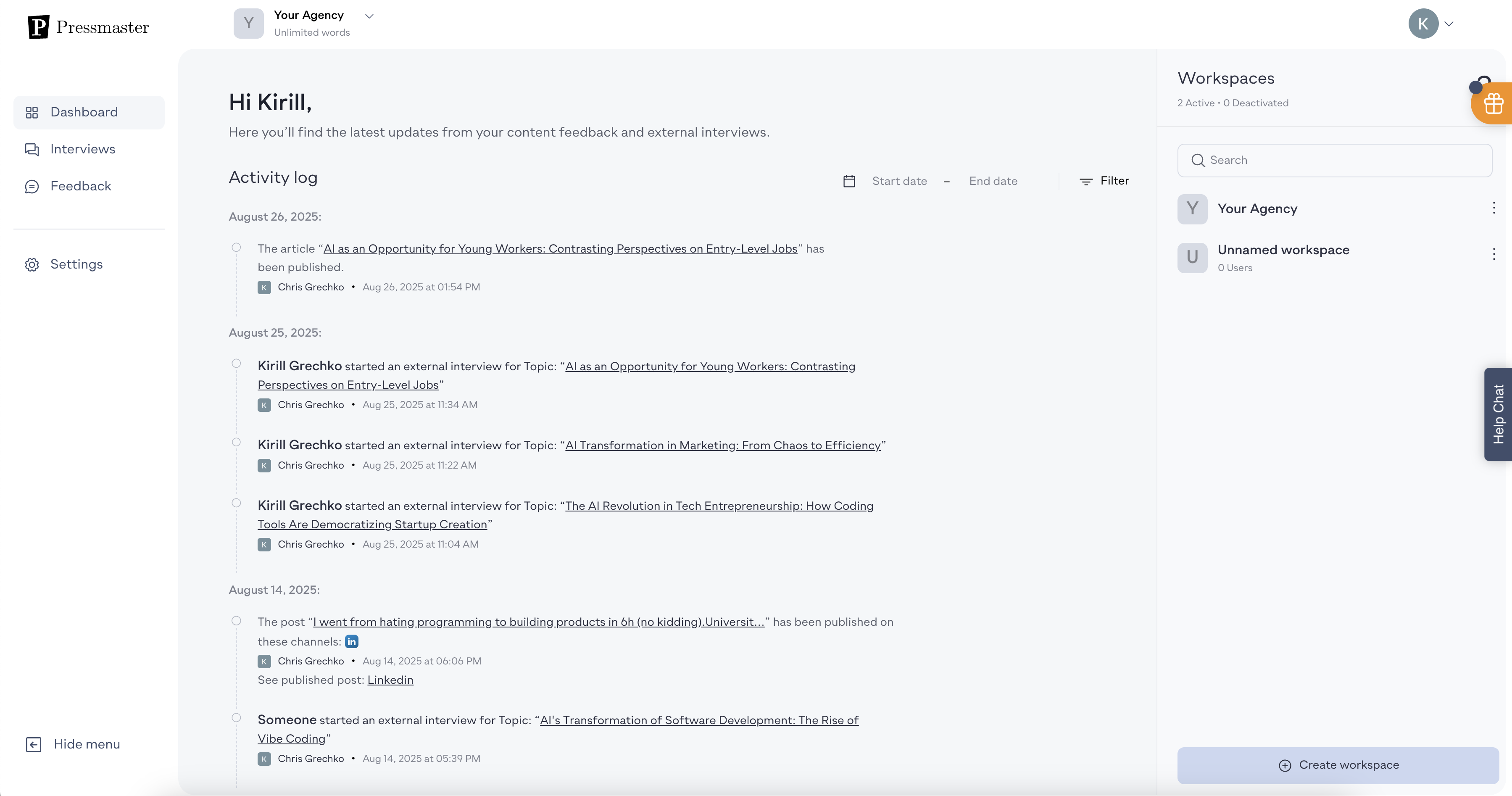 The tracking function provides comprehensive oversight of all activities within Pressmaster, enabling efficient management of interviews, content approvals, and team operations across multiple workspaces.