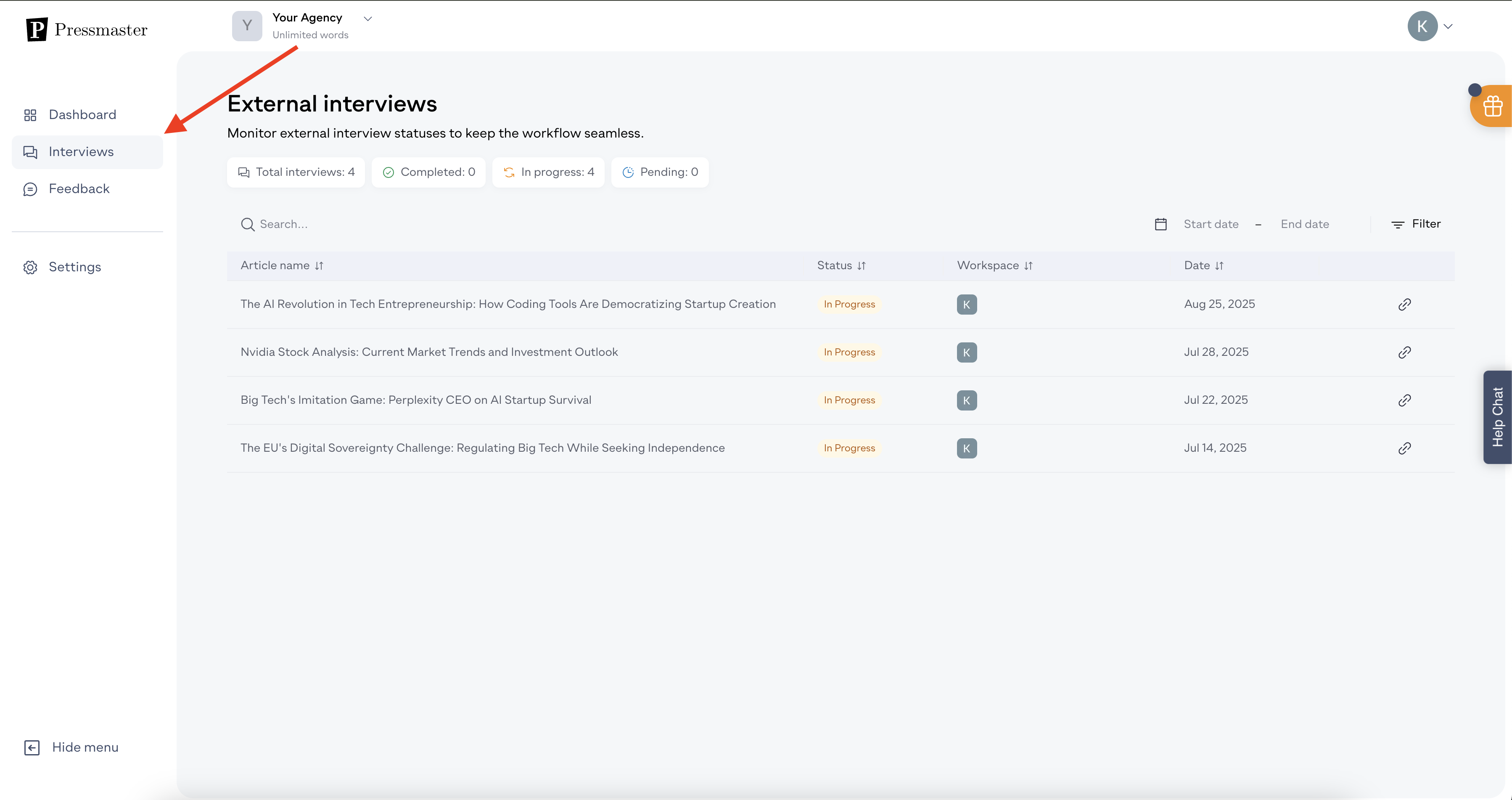 Centralized Interview Management Access the interview tracking feature by clicking on "Interviews". This system eliminates the need to log into each workspace individually to check interview status.